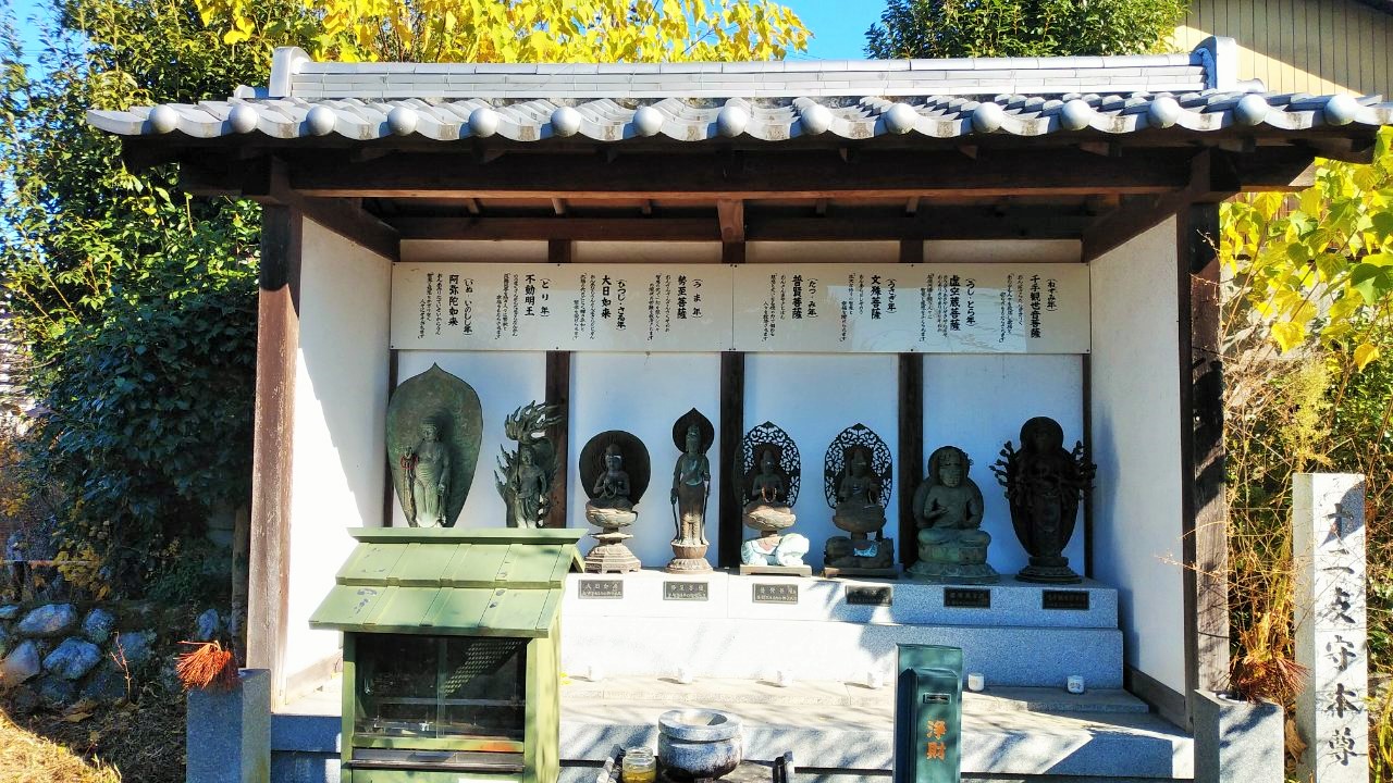 小流れの茂みの中に青銅のもとは小祠に入っていた地蔵さまが鎮座している。